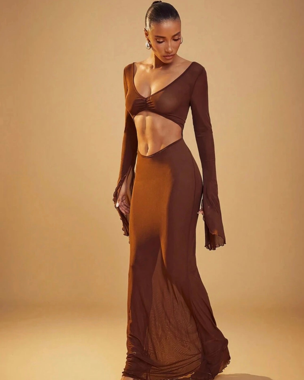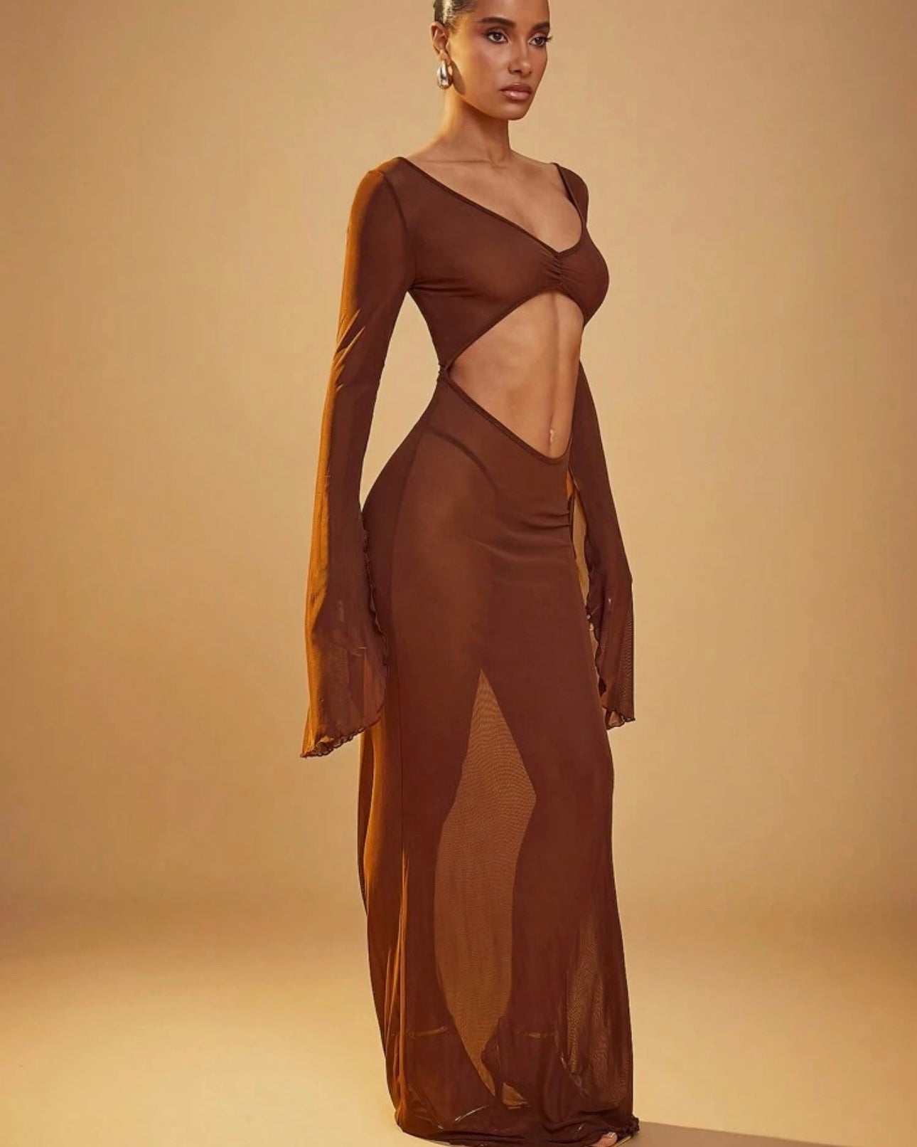 Elegant, seductive, and impossible to ignore - Muse After Dark flows like poetry on sun-kissed skin. With sheer layering, a sculpted cutout, and flared sleeves, it’s perfect for late dinners, villa balconies, or barefoot dances in the dark.