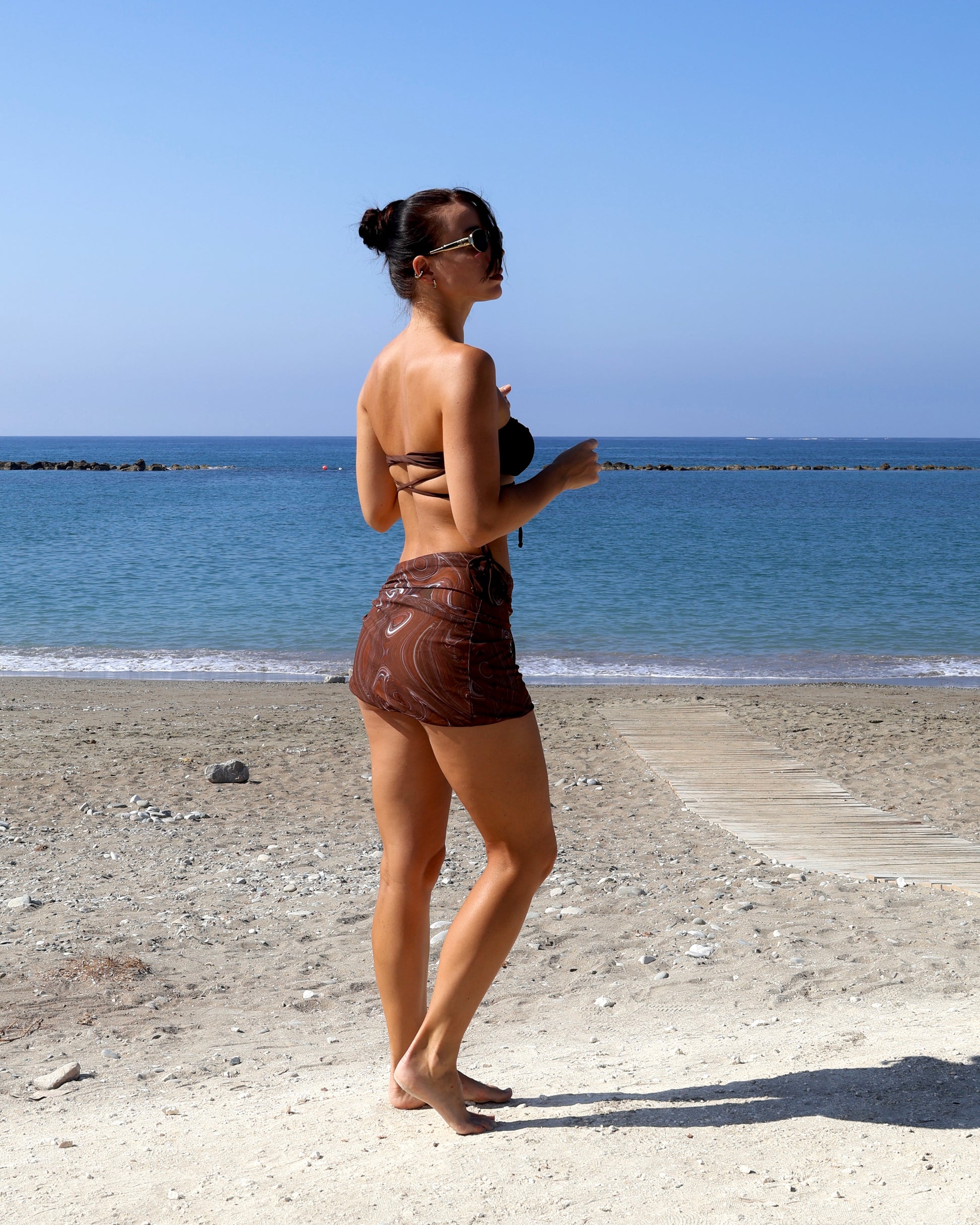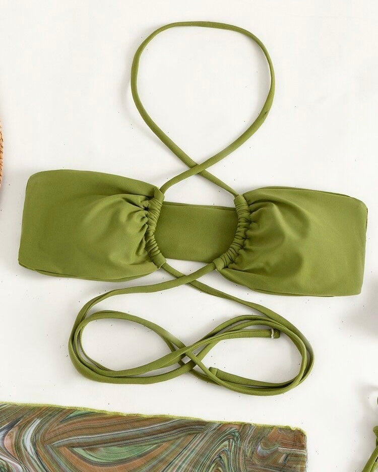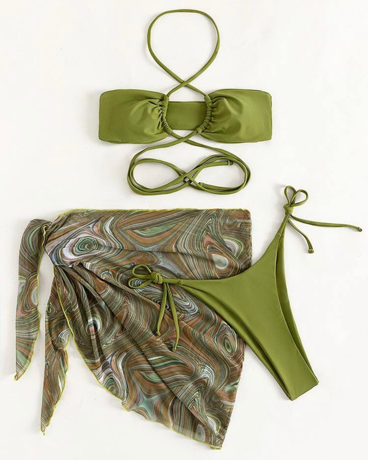 Three-piece bikini set featuring a bandeau top with wraparound ties, minimalist side-tie bottoms, and a sheer marble-print sarong. The ultimate beach-to-party ensemble.