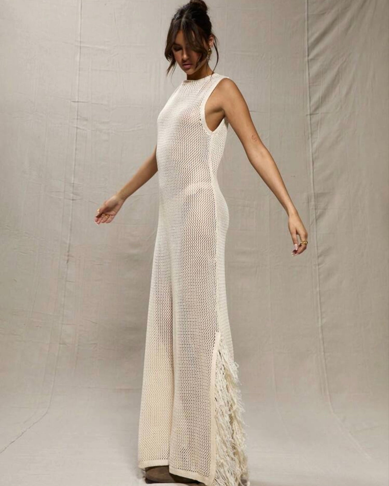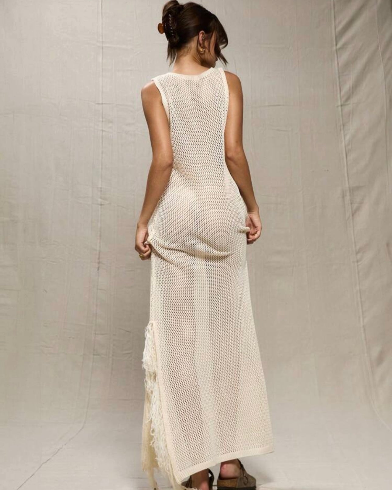 Minimalist beach dress crafted from sheer crochet mesh. A lightweight, breathable layer for poolside lounging or barefoot walks on the sand.